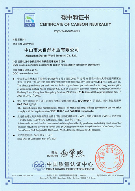 大自然家居率先獲得CQC頒發(fā)的碳中和證書