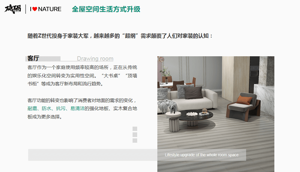 隨后,《2019粵港澳大灣區(qū)住宅精裝交付標準白皮書》主編、想象數科合伙人李可欣女士現(xiàn)場發(fā)布《2023綠色家居消費趨勢白皮書》。白皮書中指出:隨著消費者全空間的生活方式升級,全屋通鋪木地板成為潮流趨勢,重塑新時代家居空間。