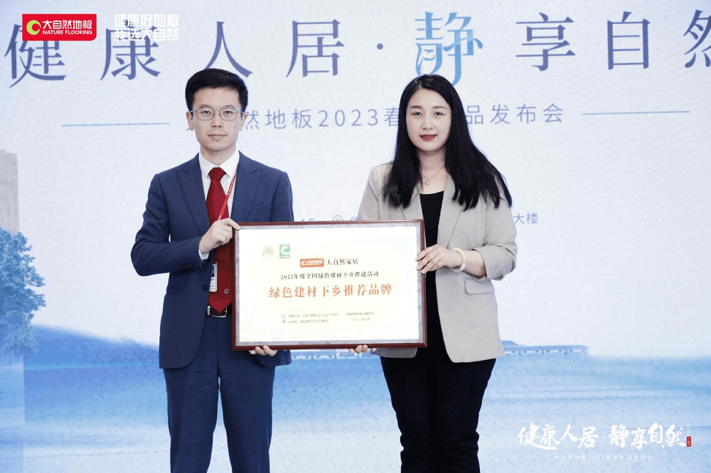 一直以來,大自然地板積極助力綠色健康產品走進更多的家庭,為中國健康人居建設不斷添磚加瓦。發(fā)布會現(xiàn)場,中國建筑材料流通協(xié)副會長馮斯靜表示:大自然家居旗下的強化地板和實木復合地板,成功入選由工信部公布的全國綠色建材產品清單和企業(yè)名錄,其產品質量、安全性、環(huán)保性、節(jié)能性、低碳化等指標都優(yōu)于常規(guī)產品,因此大自然家居也被中國建筑材料流通協(xié)會評審成為“綠色建材下鄉(xiāng)推薦品牌”,現(xiàn)場特授予此榮譽獎牌。