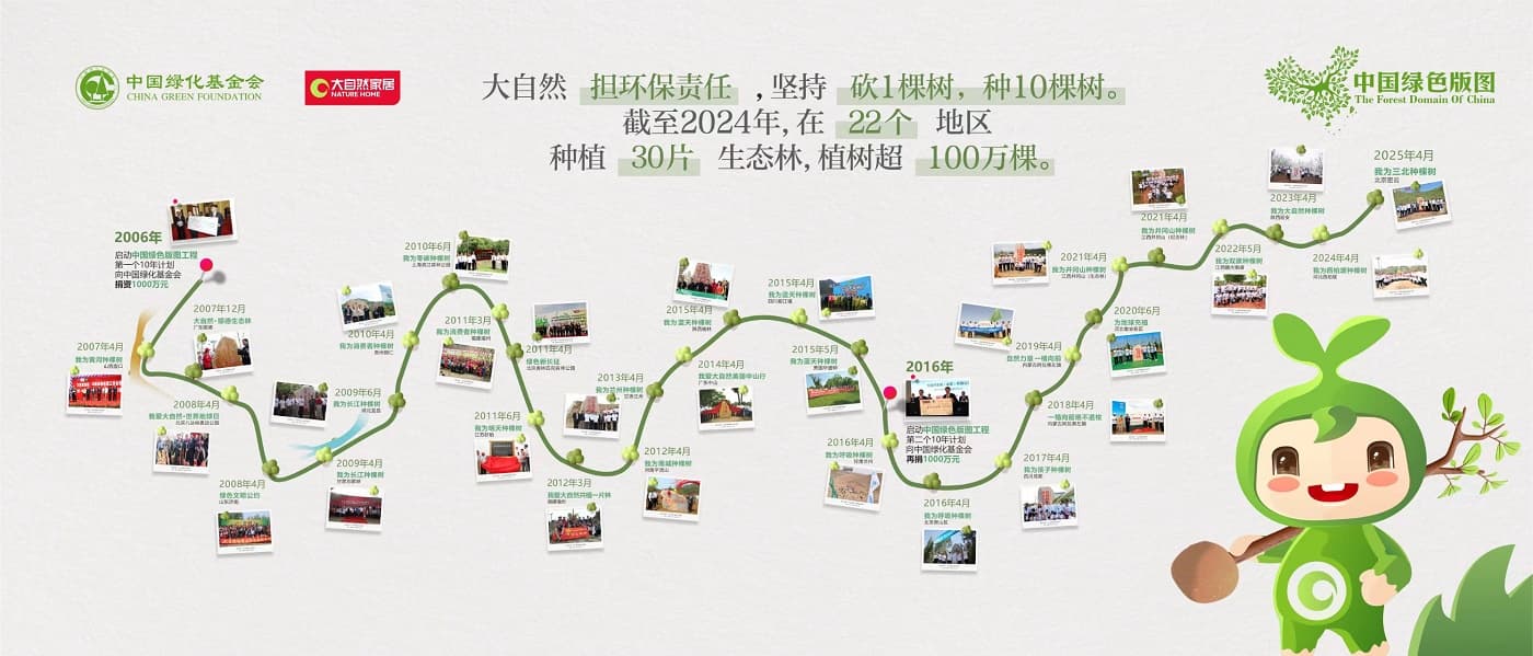 自“中國綠色版圖”工程啟動以來,大自然家居董事長佘學彬提出的“砍一棵樹,種10棵樹”理念在20年間持續(xù)踐行,以長期堅守為指引,積極推動行業(yè)走向商業(yè)向善的可持續(xù)發(fā)展道路,并帶動更多人加入守護環(huán)境、共創(chuàng)綠色未來的行列。