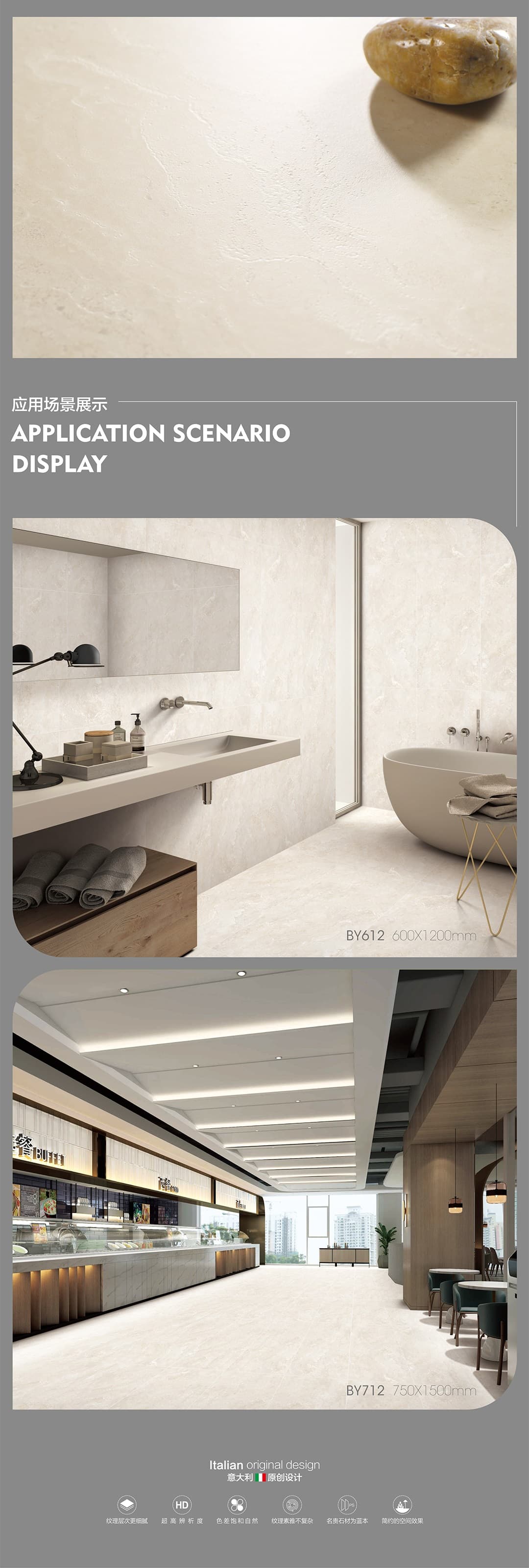 產(chǎn)品特性 表面柔和,防污效果強,防滑R10指標(biāo)高,抗折強度好